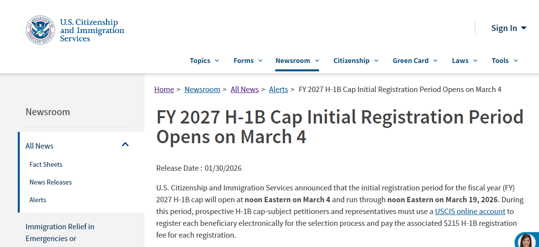 美国公民及移民服务局(USCIS)近日公布,2026年H-1B签证的网上电子注册将于美东时间3月4日中午12点启动,并于3月19日中午12点截止。请相关雇主与申请人提前做好准备,按时完成注册。