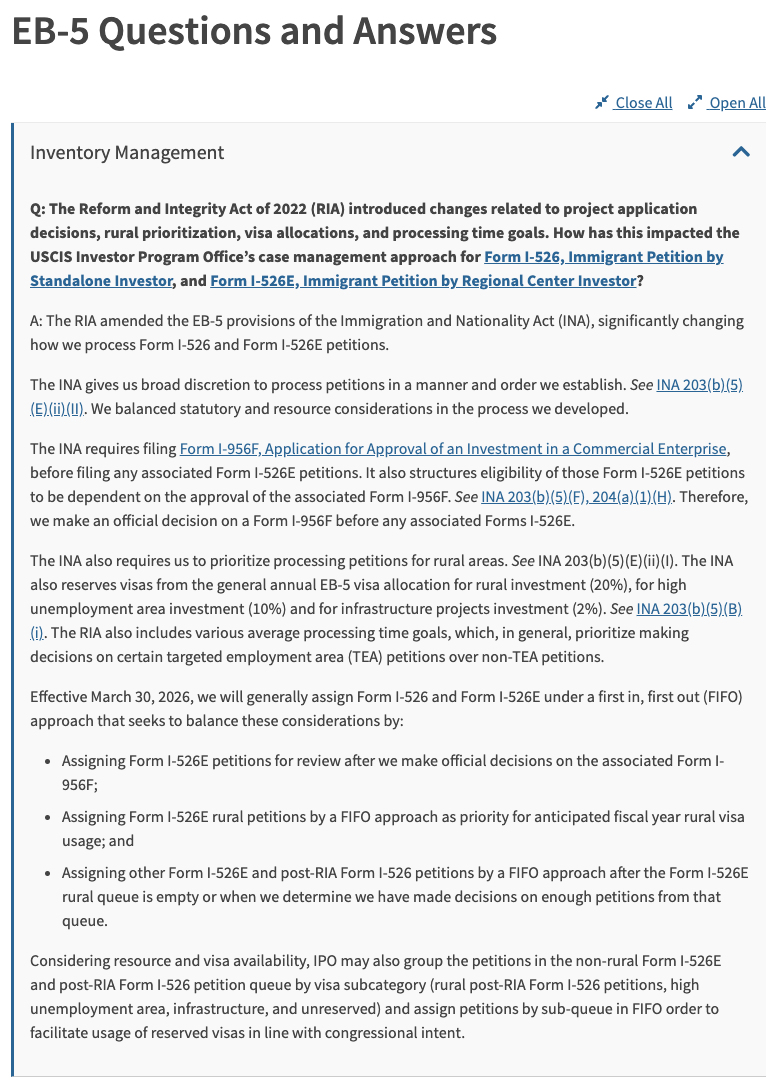 自2026年3月30日起,移民局将对I-526及I-526E申请,明确全面采用FIFO(先到先审)的原则进行审理。