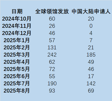 不过,在新政下,中国申请人仍是最大受益群体。虽然6月仅有17人获得签证,占比30.9%,但7月迅速放量至142人,占当月全球发放量的74.7%,8月虽回落至69人,占比仍维持在74.2%的高位。