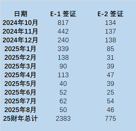 L-1签证:签发量逐月上升,从6月的522张增至8月的747张,显示跨国公司内部调动需求持续回暖。
