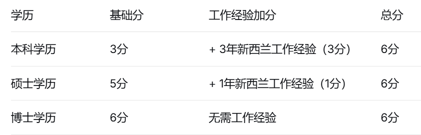 如果你的职业不在绿名单上,也别担心——"六分制"为你提供了另一条清晰的路径。顾名思义,六分制通过综合评估你的学历、新西兰本地工作经验、收入等维度进行打分,满6分即可申请(同样需要获得认证雇主Offer)。常见组合方式如下: