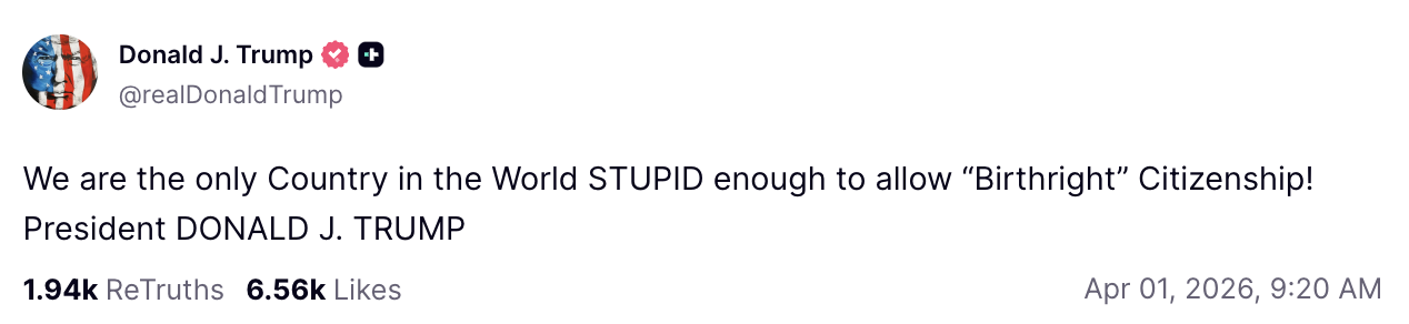 特朗普在第二任期上任第一天就签署了行政令,试图剥夺在美国出生、且出生日期在2025年2月19日之后的某些移民子女的出生公民权。
