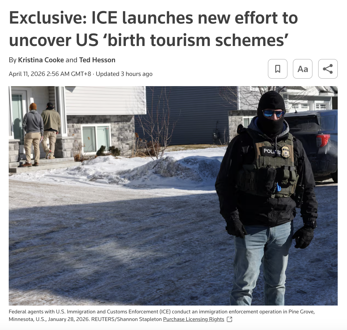路透社获取的美国移民与海关执法局(ICE)内部邮件显示,该局在4月9日发出的通知中,已要求全美调查人员将该生育旅游专项行动列为当前执行重点,明确行动目标为查处协助怀孕外国人赴美分娩、帮助新生儿骗取美国公民身份的犯罪网络。